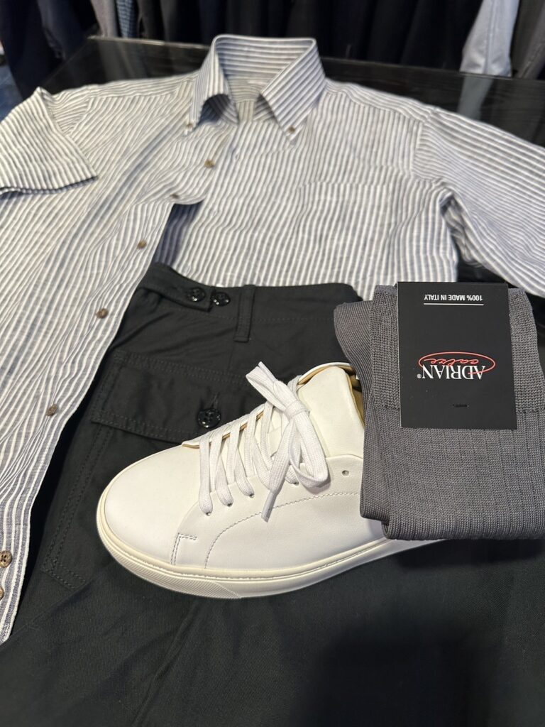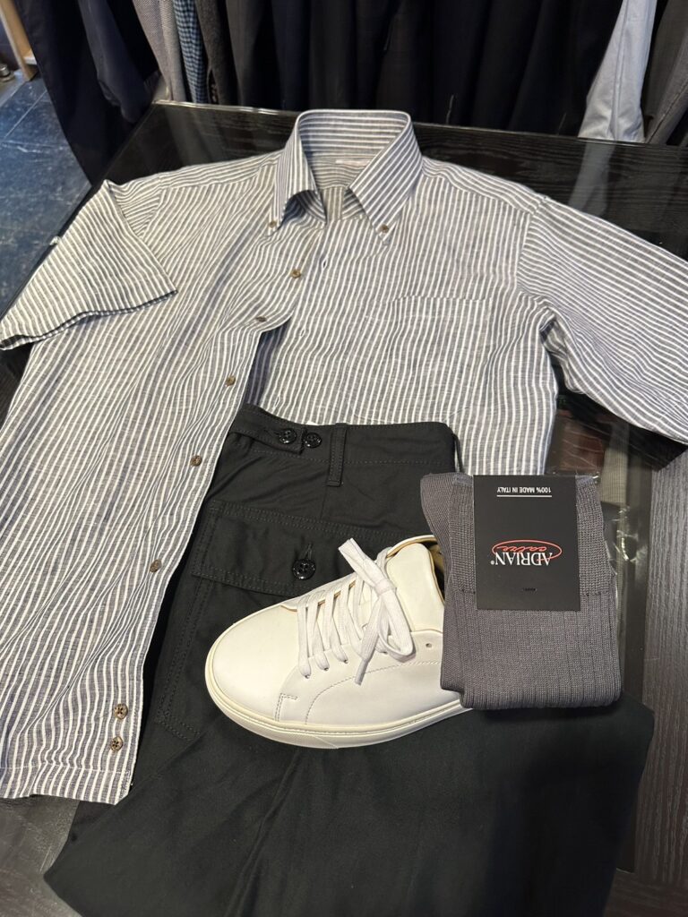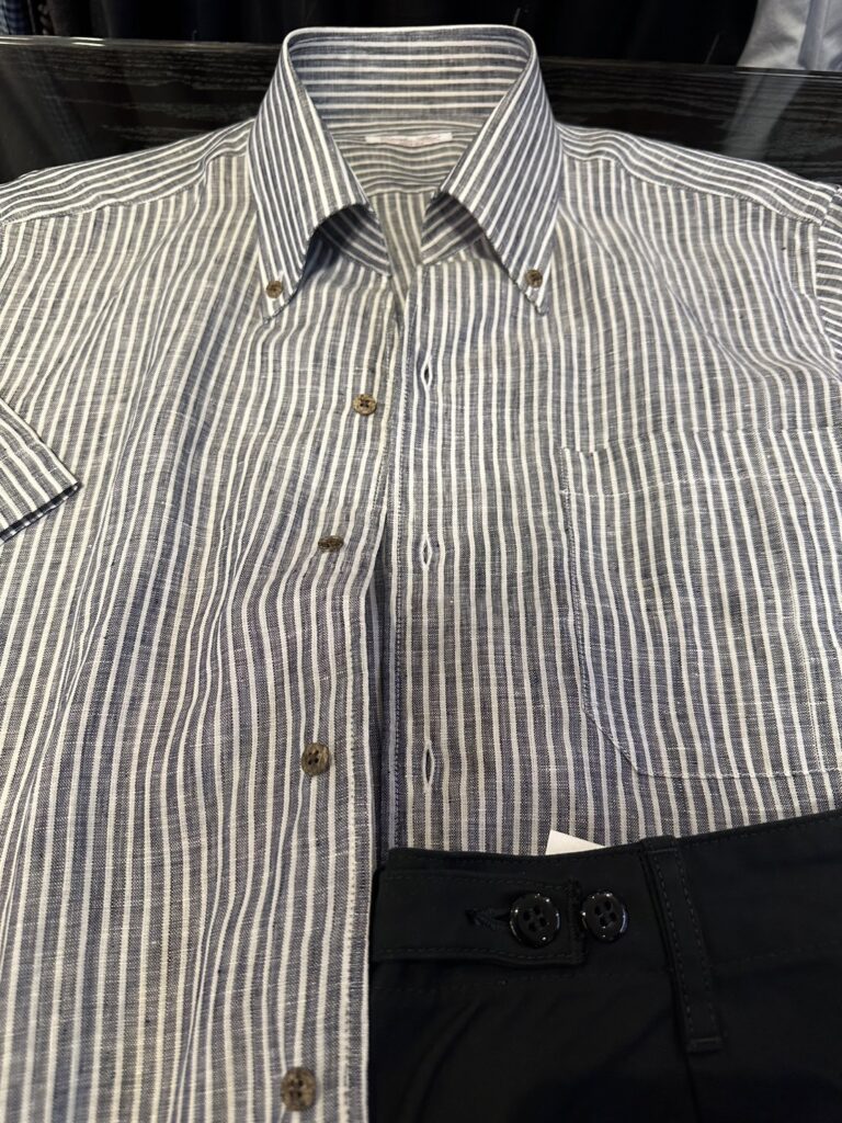 衿型は、スキッパーボタンダウンにして、高さがあるので少し襟の動きがでるので